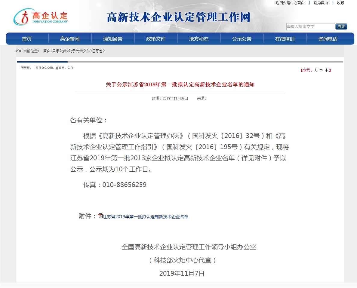 11月7日,国家科技部全国高新技术企业认定管理工作领导小组办公室通过科技部火炬中心官网发布《关于公示江苏省2019年第一批拟认定高新技术企业名单的通知》,南京云磁电子科技有限公司榜上有名,目前已顺利通过公示,正式予以认定。